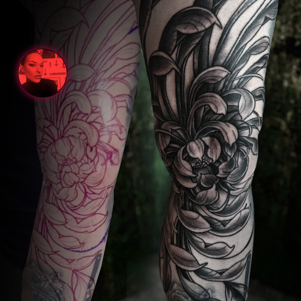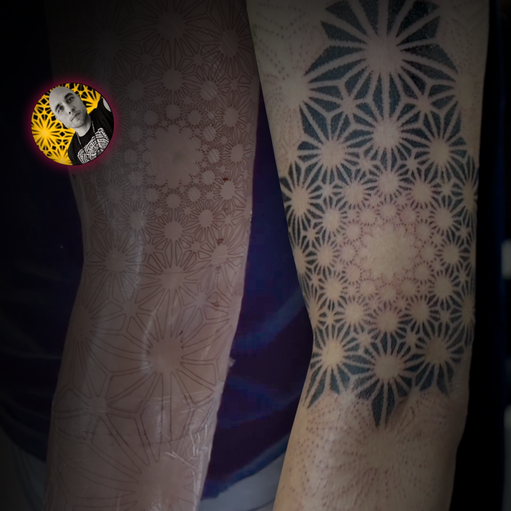 STANDSTILL is designed primarily for lining and dotwork. Since the film is water-soluble, it won’t hold up under heavy shading or color packing. After completing the outlines, simply dissolve the film with green soap and distilled water to continue with shading. We recommend using needles up to 9 RL.
